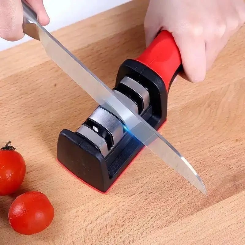 El afilador de cuchillos rojo de 3 etapas es una herramienta diseñada para afilar y mantener la nitidez de tus cuchillos, debe pasarse por cada etapa, así:
